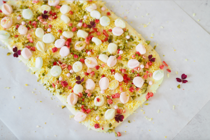 Smelt chokoladen, og smør chokoladen ud på et stykke bagepapir. Jeg klippede mine skumfiduser i mindre stykker, og dryssede med mini skumfiduser, kokosmel (farvet gult med lidt gul frugtfarve eller pastafarve), finthakket pistacienødder, frysetørrede jordbær. Jeg pyntede af med sukkerperler og skovsyrer.