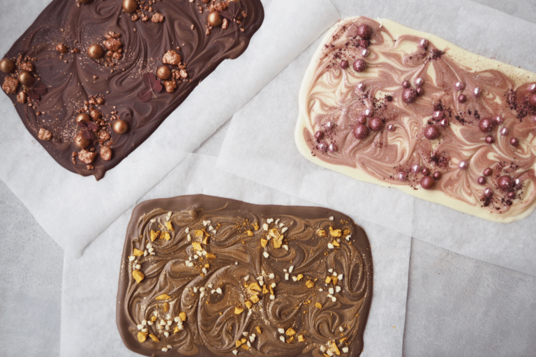 Smelt chokoladen og smør næsten al chokoladen ud på et stykke bagepapir. Gem ca. 1 spsk chokolade og rør det sammen med lidt bronzestøv, og dryp det ud over den hvide chokolade. Tag en tandstik og træk i chokoladen. Hak eller blend de 20 g chokoladen og kom det i en pose sammen med bronzestøv. Dekorer med det dine skuffer byrder på efter julen. Jeg havde lidt bronzefarvet chokoladekrymmel, bronzefarvet chokoladekugler og rød skovsyrer.