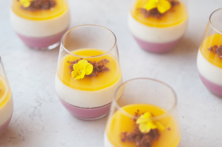 Fordel forsigtigt mangogeléen i glassene og brug gerne en ske, til at fordele med. Lad mangogeléen sætter sig en smule før kiksekrymlet fordeles. Pynt af med en spiselig blomst.