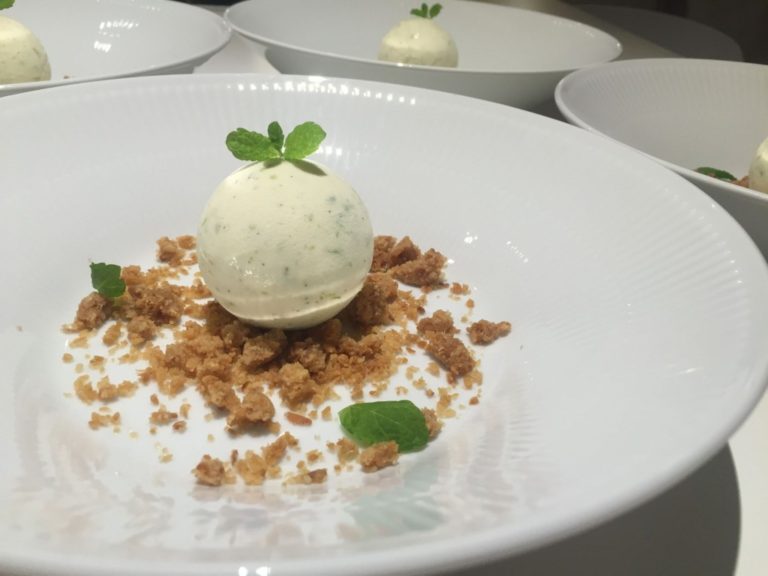 Drys lidt kokoscrumble ud på en tallerken eller fad. Når parfait isen er klar, tages isen ud af halvkuglerne og to halvkugler sættes sammen. Glat evt. kanten/samlingen med en varm finger. Placer din parfait iskugle ovenpå kokoscrumblen, og pynt af med mynteblade.